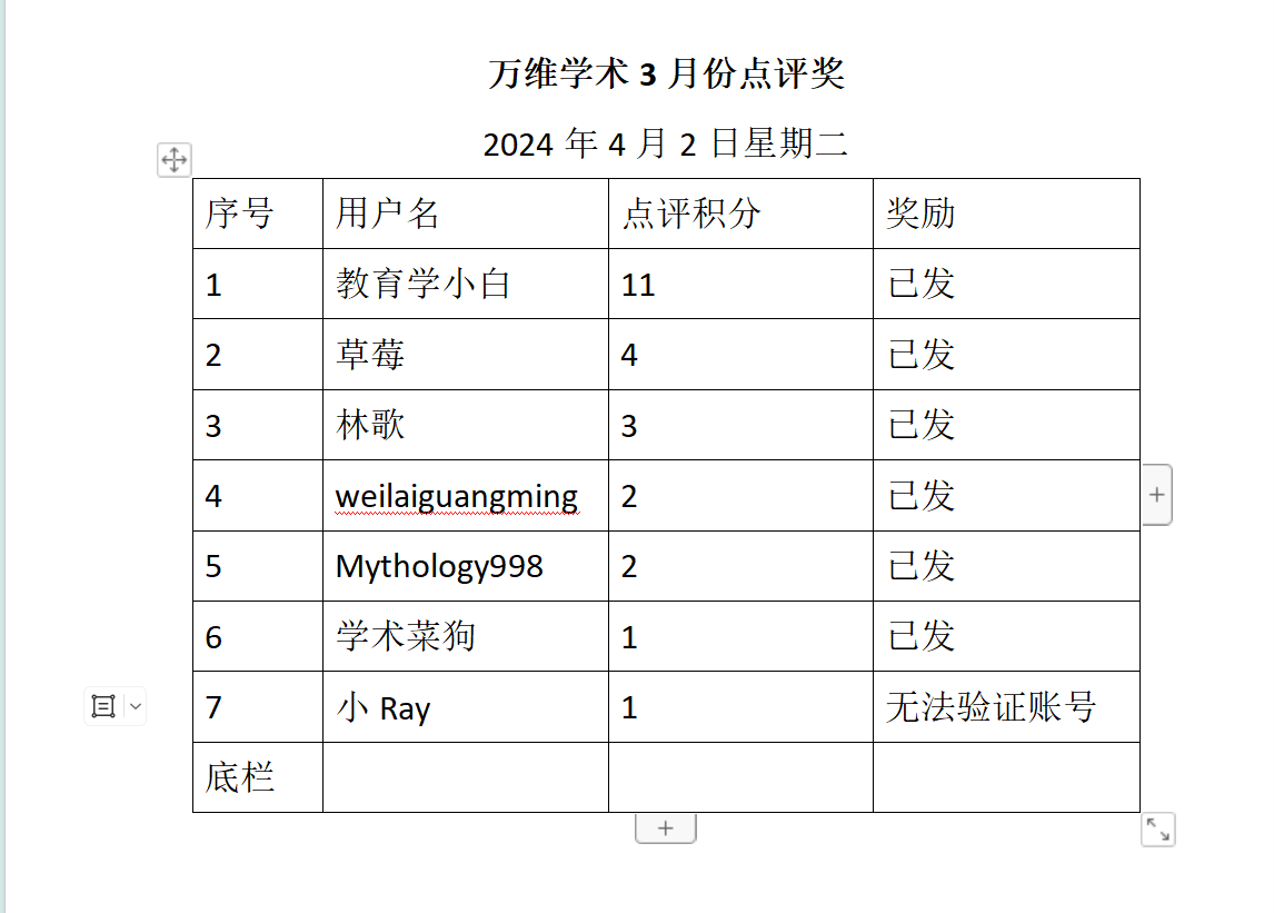 下面是2024年3月份点评发奖名单。由于上线时间不长,参与点评的不多,我们暂定的发奖人数是前100名,基本参与点评就 可以获奖,欢迎大家分享投稿经验!